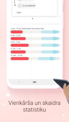 Atklājiet dziļāku ieskatu par savu menstruālo veselību, izmantojot detalizētās funkcijas. Lietotne ļauj jums ne tikai sekot līdzi mēnešreižu datumiem, bet arī rūpīgi analizēt neregulāras norises, premenstruālo sindromu (PMS) un asins apjoma izmaiņas. Jūs iegūsit vērtīgu informāciju par to, kādam vajadzētu būt jūsu cikla ilgumam un intensitātei, salīdzinot ar personīgajiem datiem, tādējādi ļaujot ātri pamanīt jebkādas novirzes no individuālās normas. Šī personalizētā pieeja sniedz iespēju proaktīvi rūpēties par savu pašsajūtu un labāk sagatavoties dažādiem cikla posmiem.