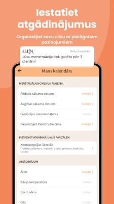 Ar Selin jūsu rīcībā ir precīzs menstruāciju izsekošanas rīks, kas atvieglo nākamā cikla prognozēšanu, balstoties uz rūpīgi izstrādātiem algoritmiem. Tas ļauj viegli sekot līdzi mēnešreižu sākumam un ilgumam, kā arī identificēt auglīgo periodu un ovulāciju, kas ir kritiski svarīgi gan grūtniecības plānošanā, gan tās izvairīšanā. Selin sniedz iespēju detalizēti pierakstīt simptomus, garastāvokli un plūsmas intensitāti, tādējādi veidojot visaptverošu jūsu veselības attēlu. Personalizēti atgādinājumi nodrošina, ka nekad neaizmirsīsiet svarīgus datumus – vai tas būtu ovulācija, mēnešreizes, kontracepcijas lietošana vai ārsta apmeklējums.