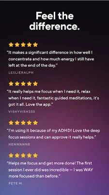 Brain.fm atšķiras no citiem skaņu risinājumiem, pateicoties savai patentētajai tehnoloģijai, kas balstīta uz smadzeņu viļņu sinhronizāciju – daudz efektīvāk nekā parastie binaurālie toņi vai izohroniskie toņi. Mūsu AI radītā mūzika spēj desmitkārtīgi pastiprināt fokusu un koncentrēšanos, vienlaikus divkārt samazinot spriedzi un trauksmi, nodrošinot nepieciešamo mieru un skaidrību. Ja cīnāties ar uzmanības deficīta un hiperaktivitātes sindromu (ADHD), Brain.fm piedāvā speciāli izstrādātu "ADHD režīmu", kas sniedz papildu stimulāciju, palīdzot uzturēt fokusu un sasniegt maksimālo potenciālu.